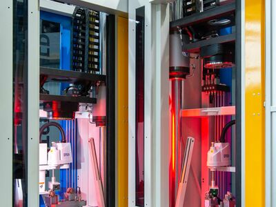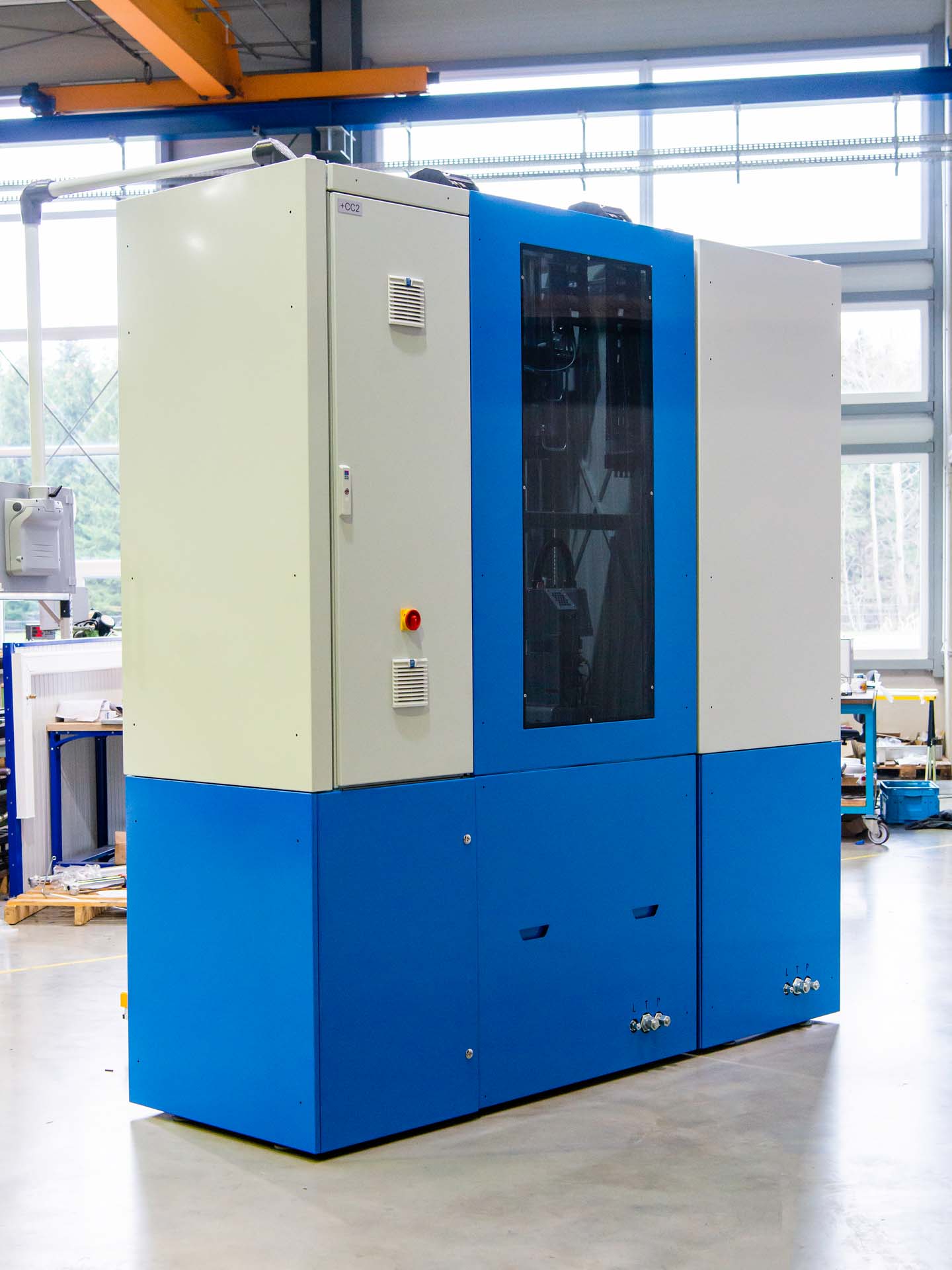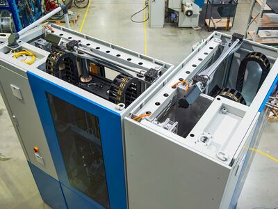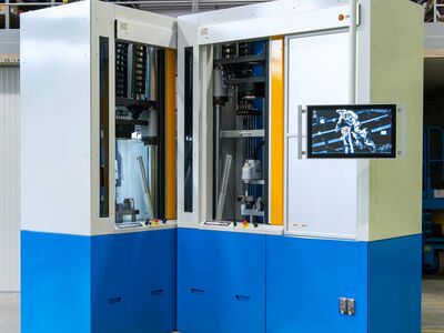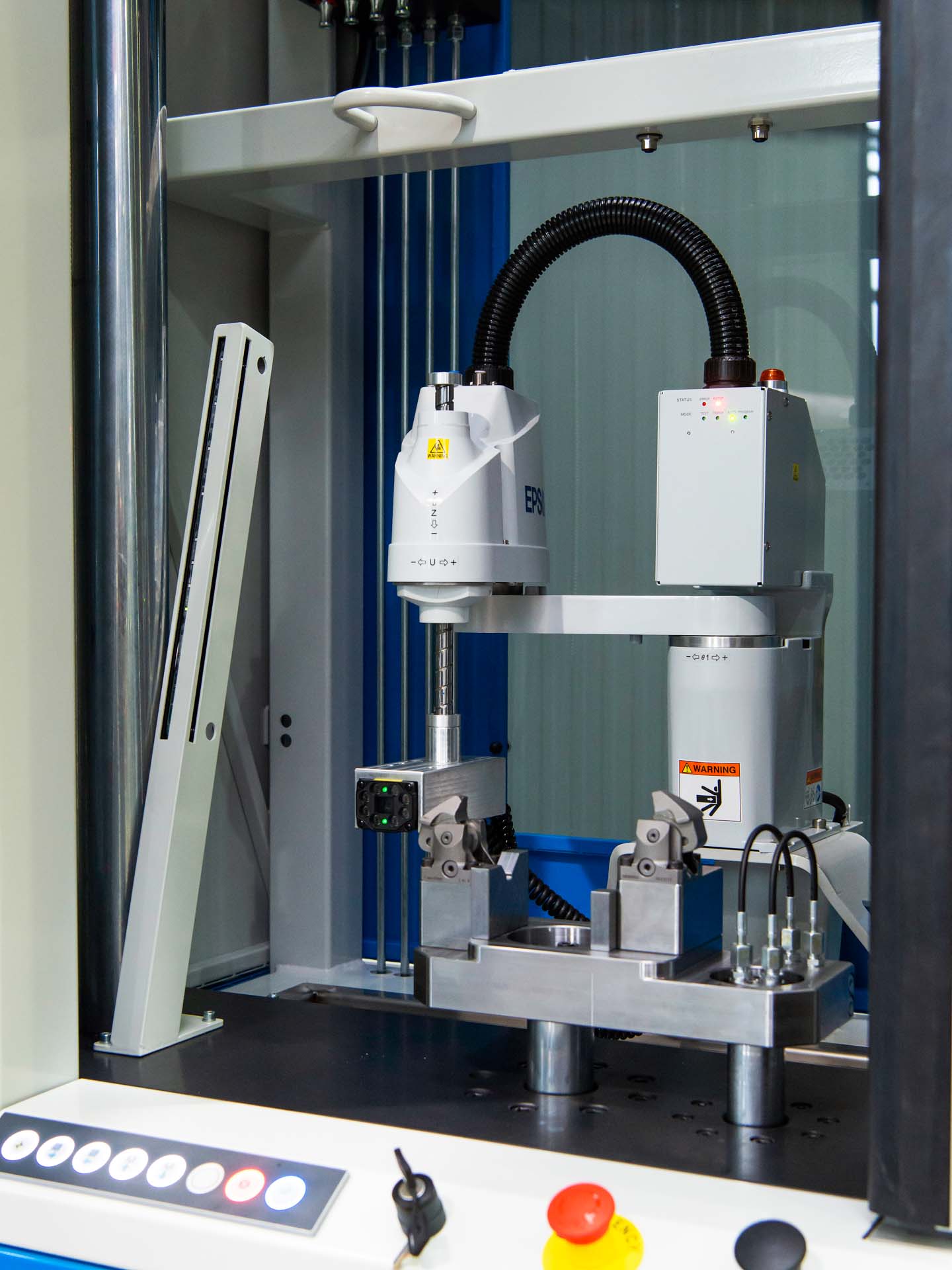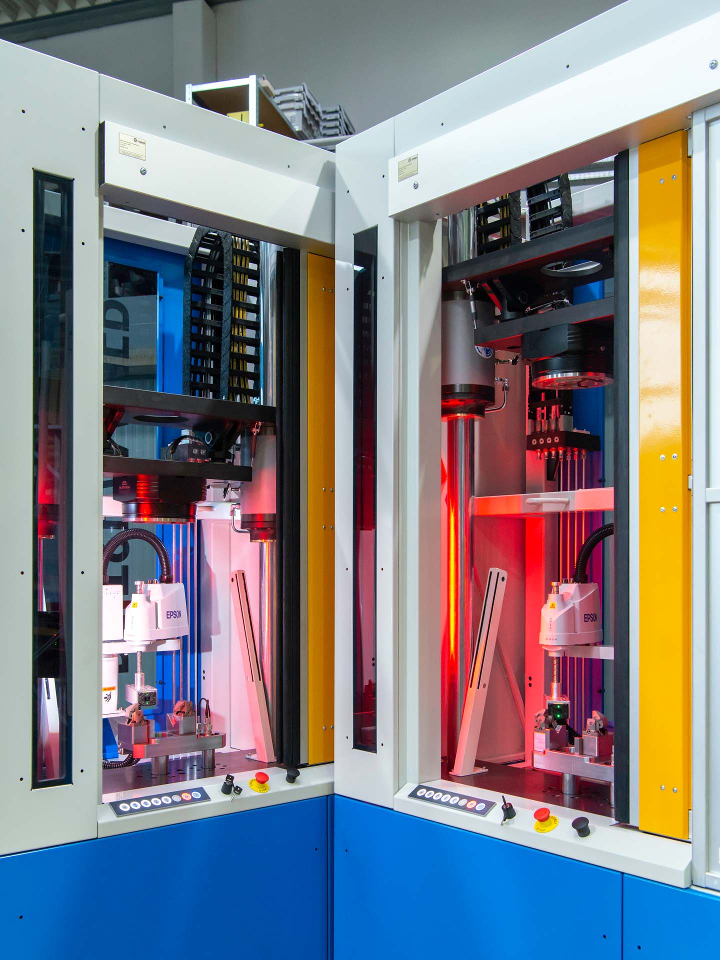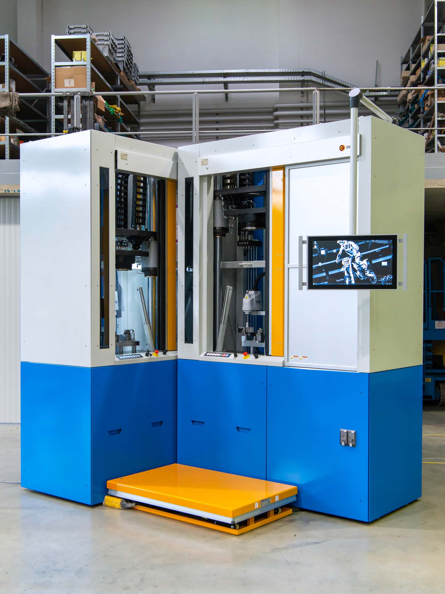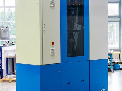 Mit dieser Maschine wird eine 100% Prüfung von produzierten Federgabeln für Motorrädern durchgeführt. Für ein prozessparalleles Bestücken wurde der Prüfraum in doppelter Ausführung realisiert.