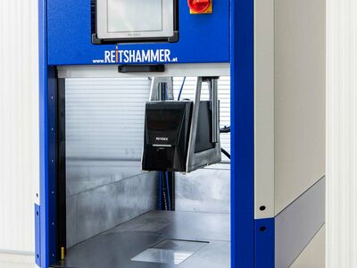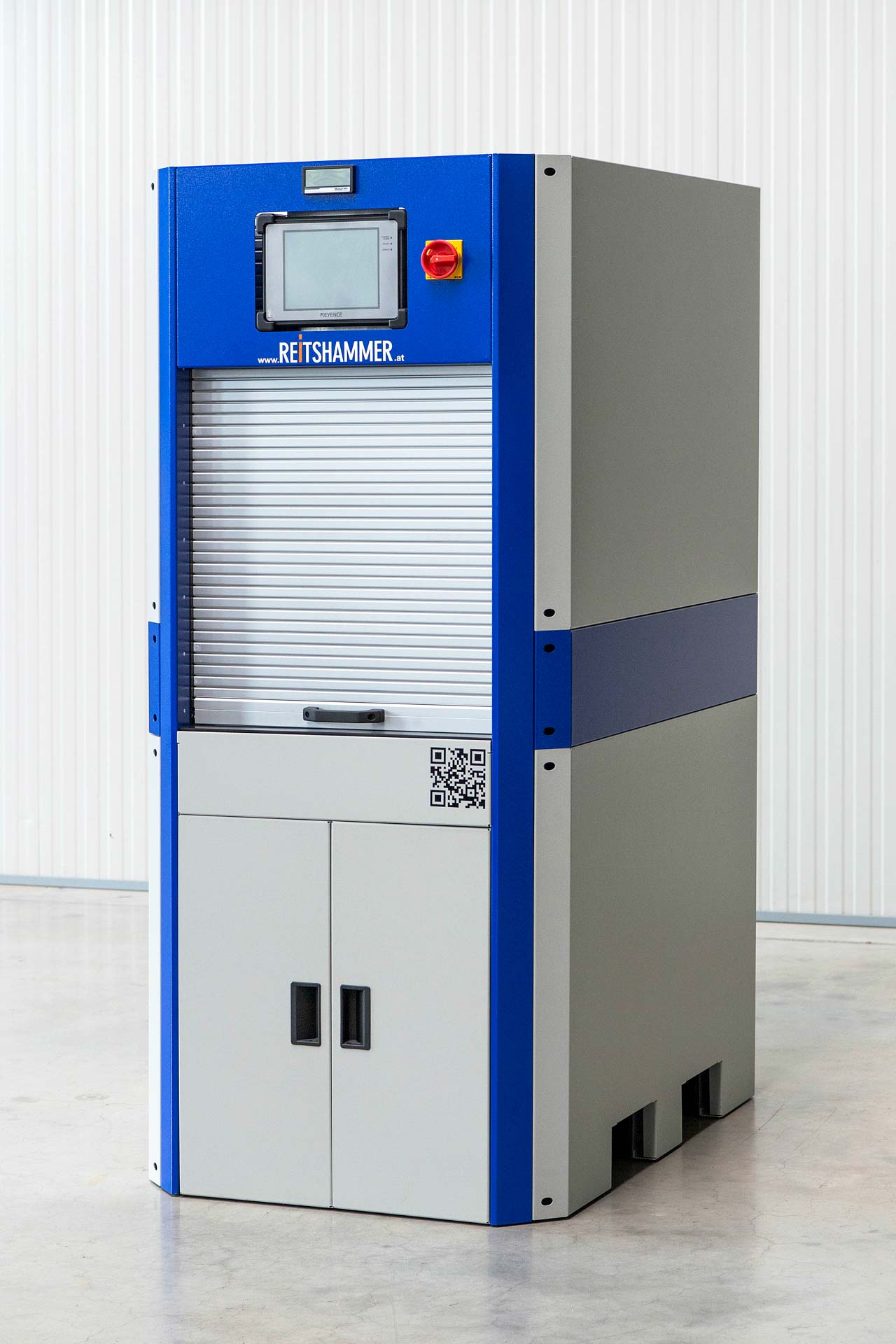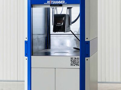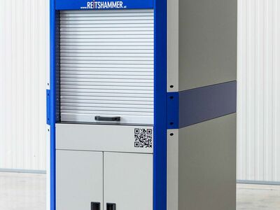 Flexible Zelle zum Kennzeichnen von Bauteilen. Die Zelle kann per Hubwagen transportiert werden. Für die Bauteilbestückung stehen ein manuelles Rolltor bzw. eine Schublade zur Verfügung.