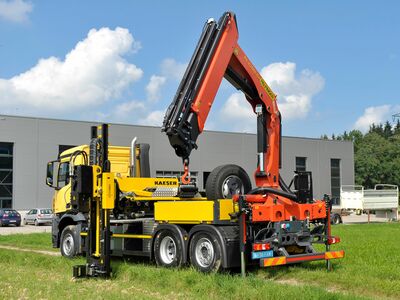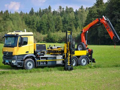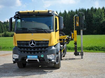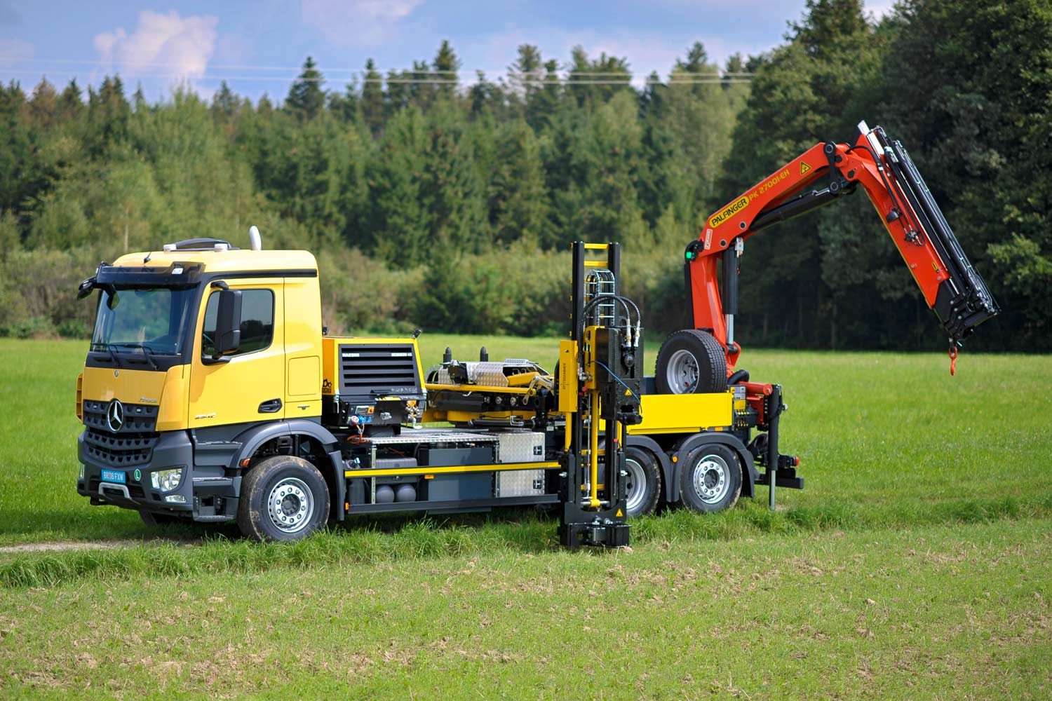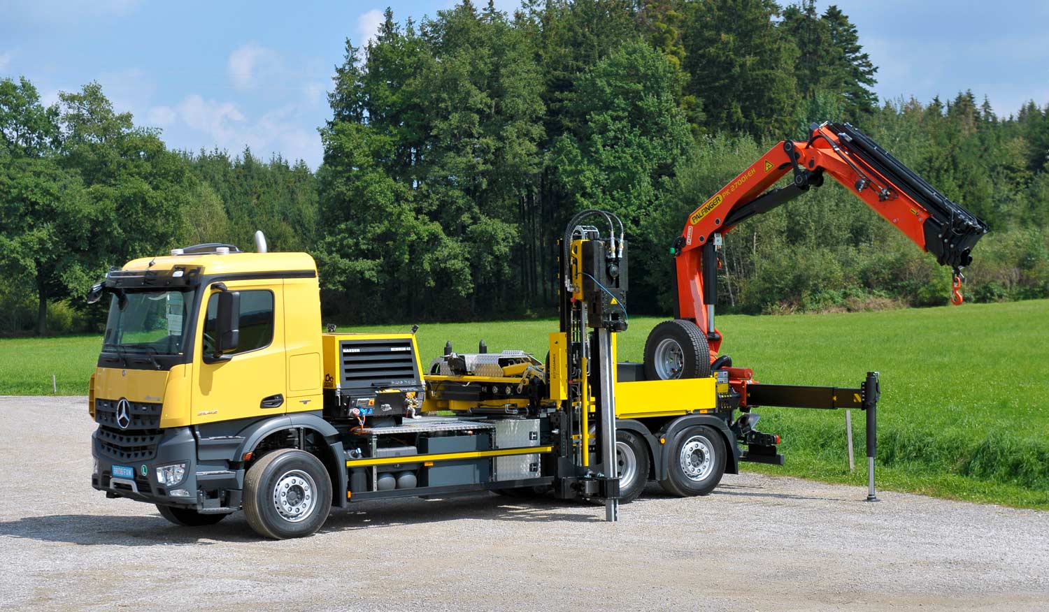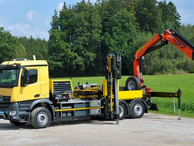Mit der Neuentwicklung aus dem Hause Reitshammer sind nun neun hydraulische Bewegungen mittels Funkfernsteuerung möglich. Drei Hydraulikpumpen am LKW sorgen für die notwendige Power des LKW Rammgeräts. Ebenso wurde ein flexibler Ladekran montiert. Ein leistungsstarker Kompressor (inkl. Generator) wurde angepasst und anschließend montiert. 400 Liter Hydrauliköl erhalten die Leistungsfähigkeit des LKW Rammgeräts.
