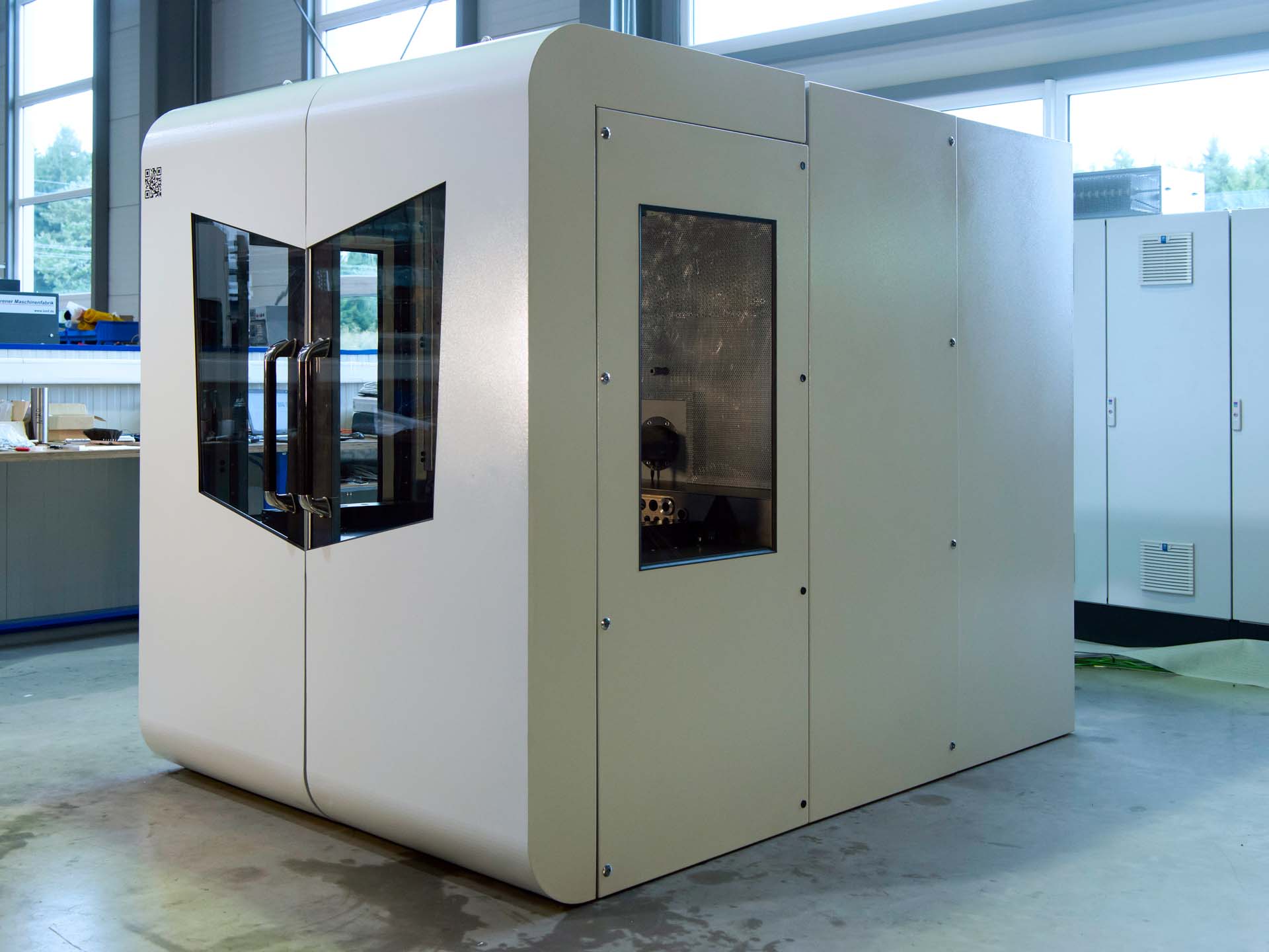 Die äußere Schutzumhausung des Prüfstandes ist mit Schallschutzelementen ausgestattet. Durch eine geeignete Gestaltung der Schutzeinrichtung ist ein Bestücken der Prüflinge (Motoren) durch einen Kran möglich.